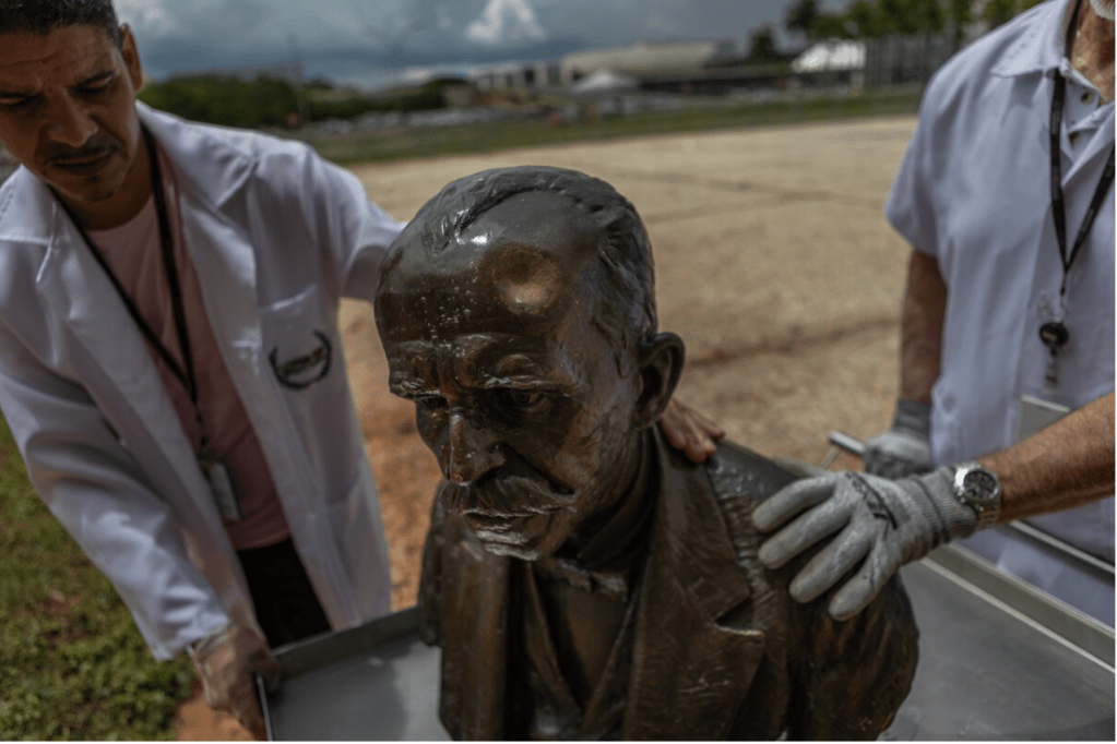 A month later, they’re making progress. Teams have restored dozens of damaged objects, including door handles in the shape of the coat of arms of the republic, bronze busts of key historical figures and the Alfredo Ceschiatti sculpture “A Justica” outside the Supreme Court.